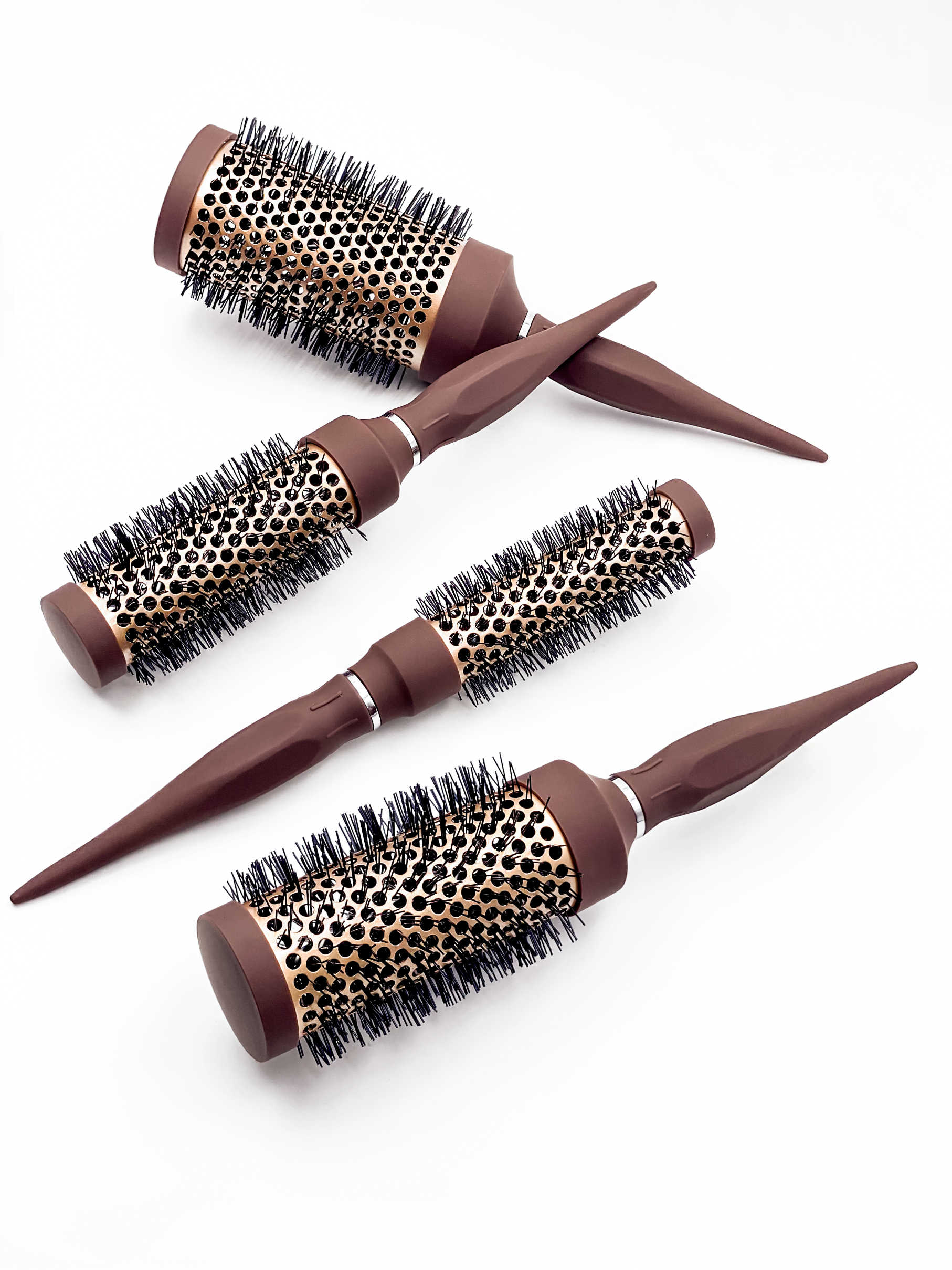 - 블로우 스타일링 : 둥근 브러시는 볼륨감을 더해주고 컬이나 웨이브를 연출하는 데 적합합니다. 머리카락의 한 부분으로 시작하여 뿌리부터 시작하여 끝까지 작업합니다. 모근 부분 아래에 브러시를 놓고 헤어 드라이어를 모간 아래로 향하게 하여 큐티클을 부드럽게 하고 곱슬거림을 줄입니다.